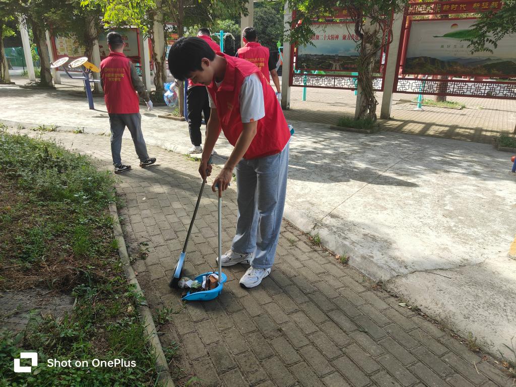 志愿者们统一身着红色志愿服,佩戴白色线手套,精神抖擞地投入到工作中。6位成员分为两个小组,第一小组负责社区公园的落叶清扫工作。他们手持扫帚,认真细致地清理着每一寸土地,确保不留死角。同时,第二小组负责花坛和草坪的杂物捡拾。在指导教师的有序指挥下,他们迅速展开行动,对公园内的卫生死角进行了彻底清理。两个小组分工明确,合作默契,大大提高了工作效率。经过两个小时的劳动,华森社区群众公园焕然一新,原本散落在公园各处的垃圾被一扫而空,花坛和草坪上的杂物也被清理干净。