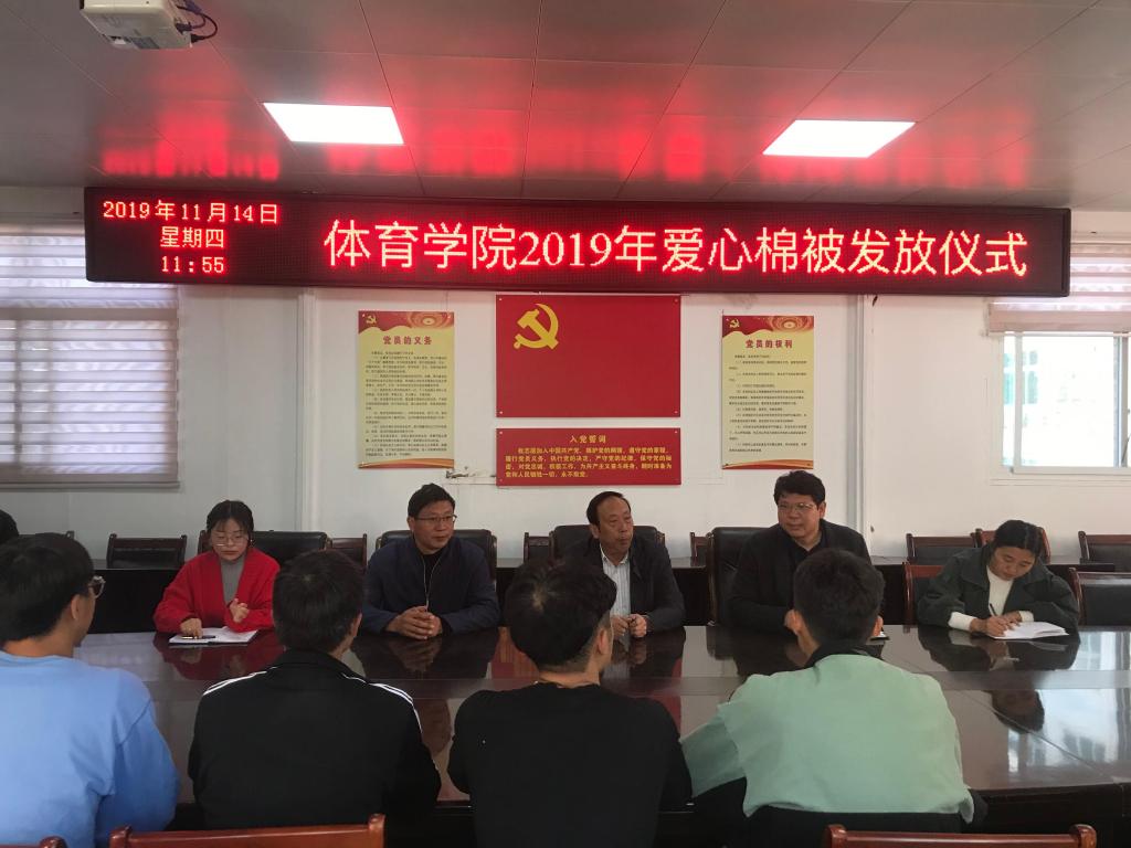 2019年11月14日永利集团304am登录在三楼会议室开展“寒冬送温暖”棉被发放仪式。党委书记陈青、副院长牛林杰、副处级辅导员柴九昌、辅导员赵倩倩、赖梦玥出席棉被发放仪式。棉被发放仪式上,首先由柴九昌老师讲明发放棉被的目的、受助同学的评选标准。接着,柴老师对同学们进行感恩教育,一床棉被很小,但是这床棉被了灌注了学校、学院对同学们的关心与爱护。不仅如此,这床棉被还教会同学们做个学会感恩、懂得感恩的人,并希望同学们以后能在社会中将这份爱传递下去。随后,党委书记陈青发表讲话。陈书记指出,学校历来重视家庭经济困难学生资助工作,学院领导和老师都非常关心家庭经济困难学生的学习和生活。学校会尽最大努力解决生活困难学生的实际问题。最后,陈书记对同学们提出希望,在困境中要拥有乐观的心态,面对困境要有自强不息的精神,立志成才,努力奋斗。