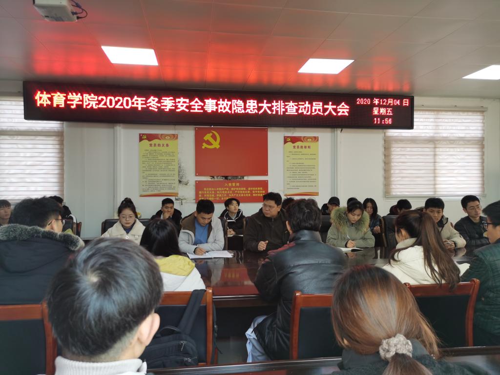 会上,柴九昌强调了,本次安全事故隐患排查以“加强安全教育、落实安全责任、强化安全意识、提高避险能力、规避可控风险”为目标,开展全方位、全覆盖、全天候的校园学生安全教育检查,各班要从集体外出和大型活动审批、请假外出学生情况、租房外宿和夜不归宿、长期不在校、消防安全隐患等方面进行自查。最后程俊辉做了补充发言,他要求各班通过主题班会、QQ群等形式把活动的目的、内容和要求传达到位,使安全意识落实到人,保证人人了解活动,人人参与活动,人人受益活动,各班要进行自查形成自查报告。