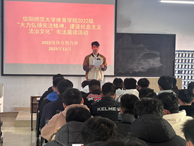 为进一步提高全体师生法律意识,引导学生深入了解宪法、尊崇宪法精神,增强法治观念, 12月7日,永利集团304am登录22级体教班在教九楼402举行了“大力弘扬宪法精神,建设社会主义法治文化”宪法晨读活动。活动由2022级辅导员赖梦玥主持,22级体教班全体学生参加。
